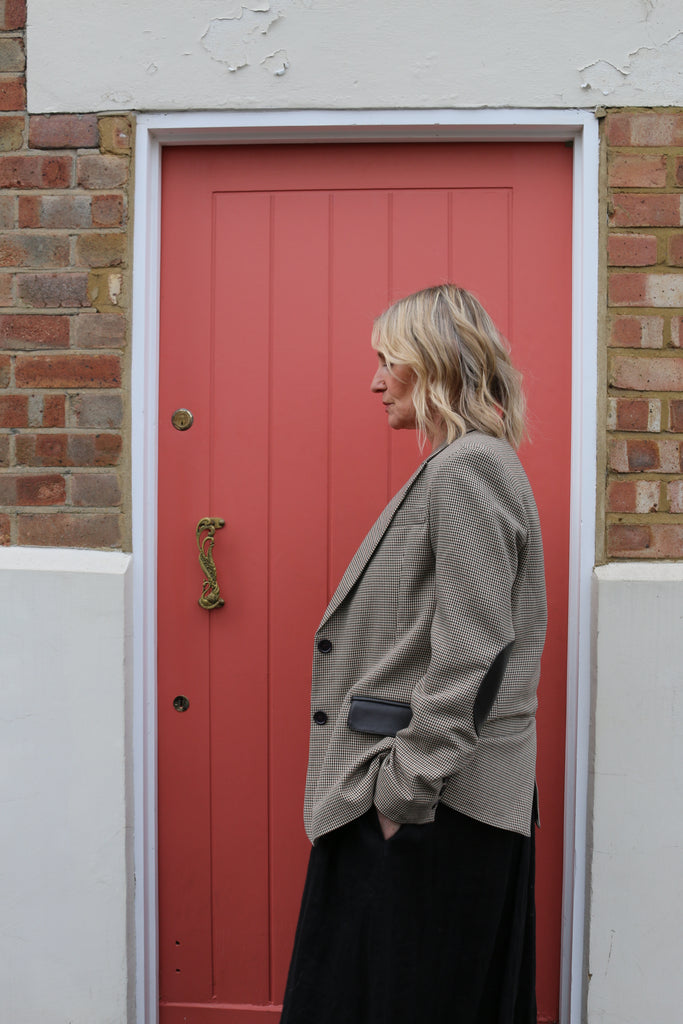 Sharp tailoring and beautifully crafted – our lightweight Pure New Wool fine check, single breasted jacket. So easy to wear, with elevated detail – dark chocolate leather trim on pocket flap and elbow patches. Soft grey felt on the under collar.