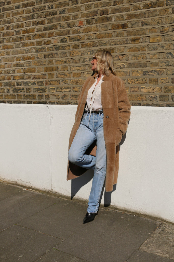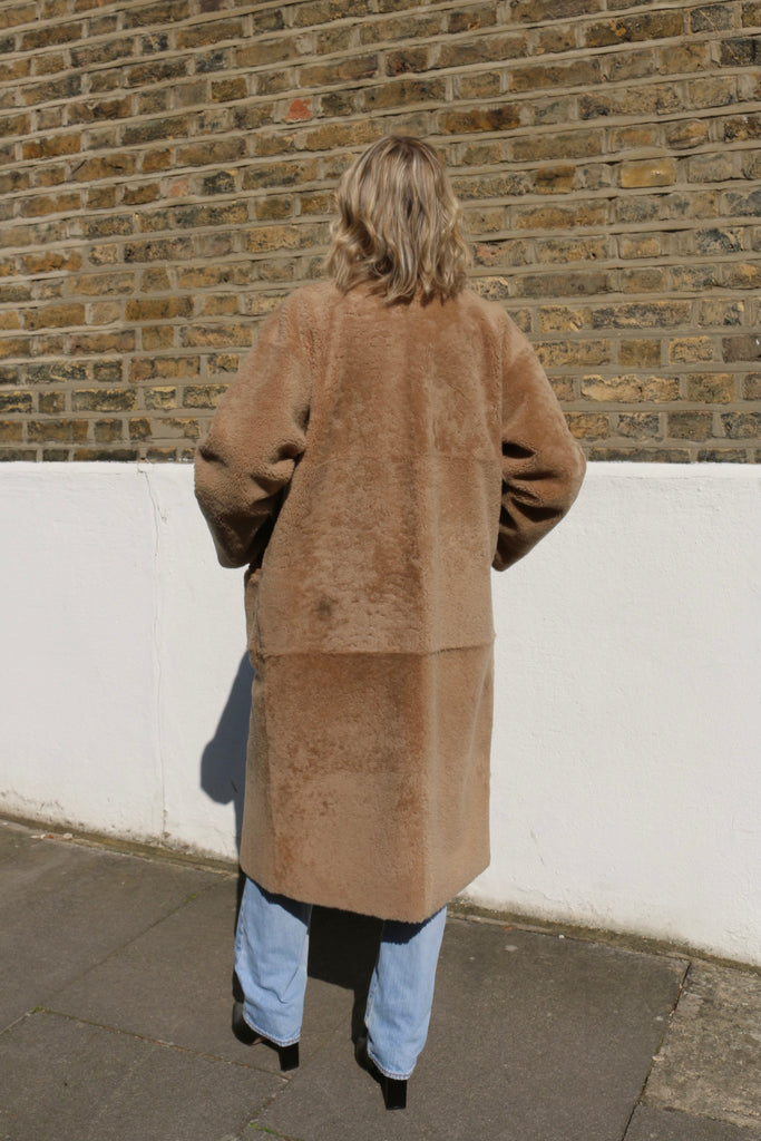 A beautifully cut, lightweight curly shearling coat, made in the colour of the season – Mocha. A modern silhouette, and so easy to wear. The perfect piece to throw over an outfit when in between seasons.