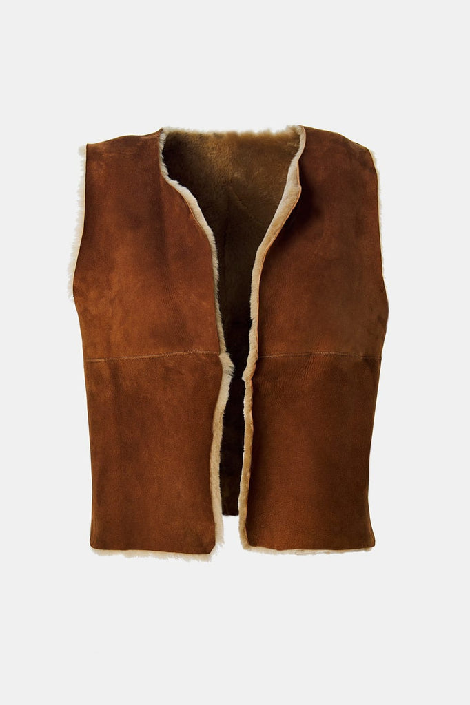 Just as chic worn reversed to show the merino shearling and cut to a slight square shape, collarless with softly curved edges. Perfect matched with a tonal outfit.