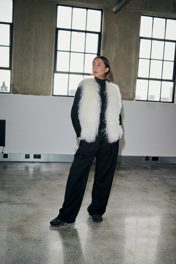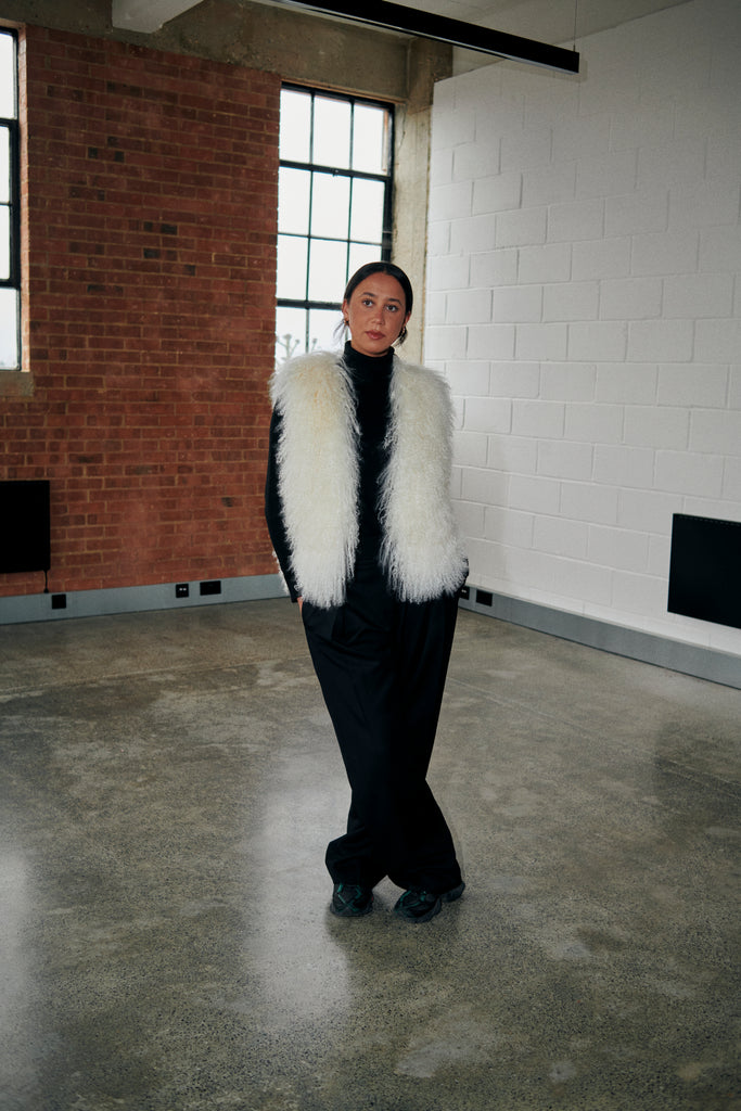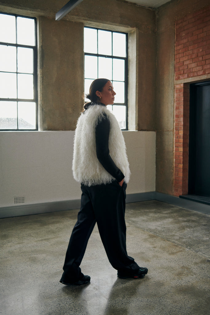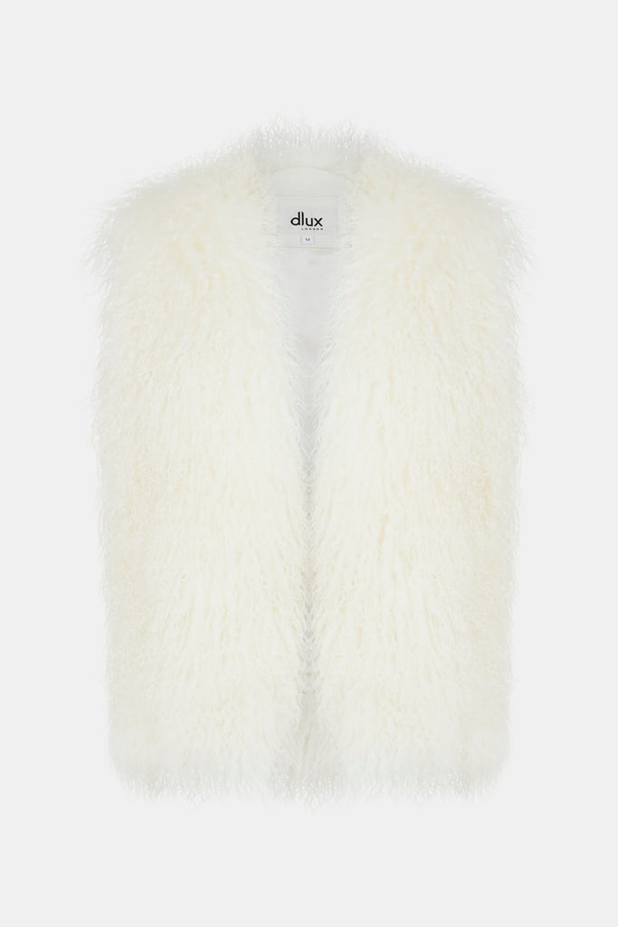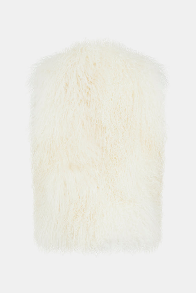 A halo of fluffiness is created when you wear this piece. A lightweight vest made from the finest Mongolian lambskin – fully lined, with soft curved edges, to give a flattering shape. Hits at the perfect length, just grazing on the hips.