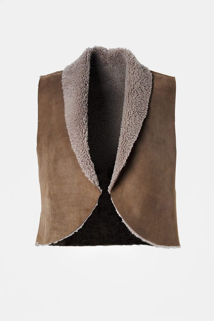Made with plush curly shearling and smooth suede reverse. Designed to be worn over a dress or shirt. Works well when utilised as an extra layer under or over a coat or jacket.