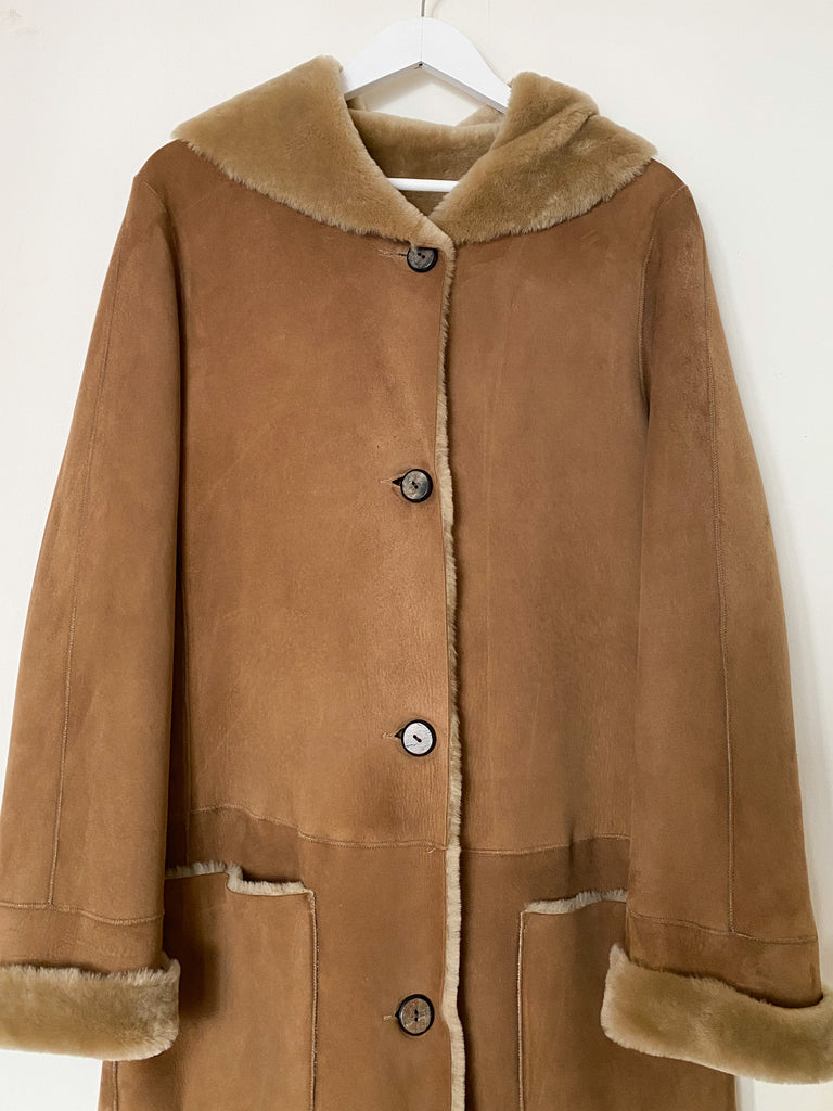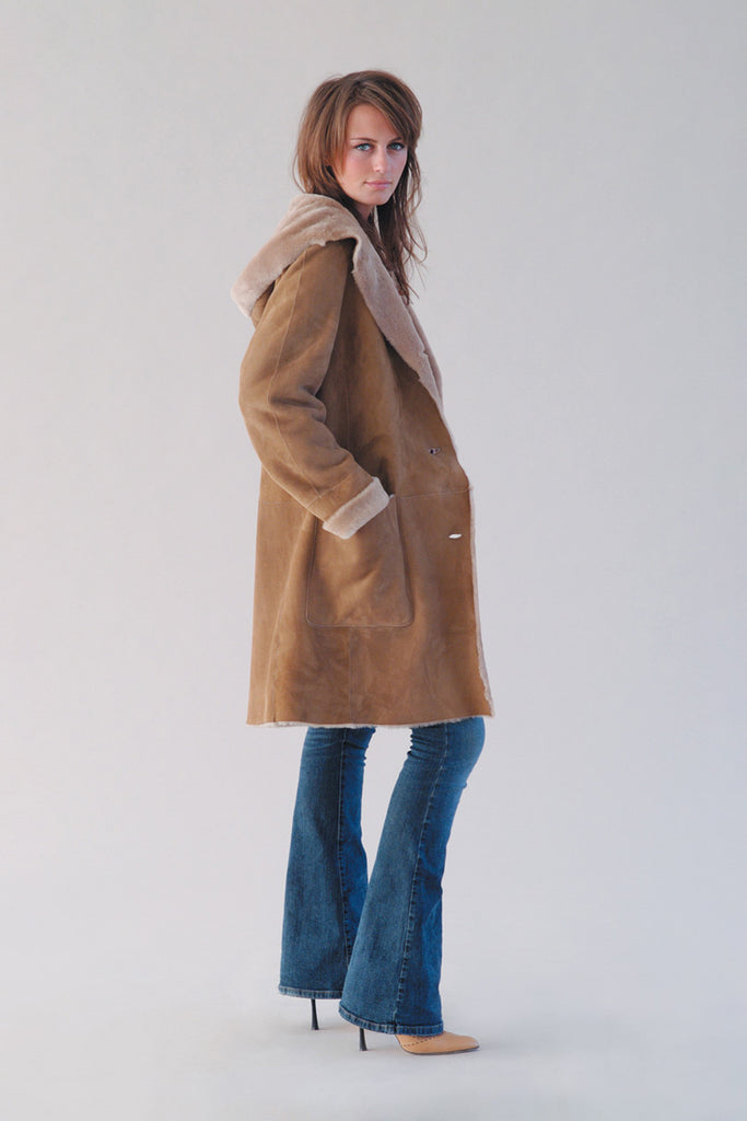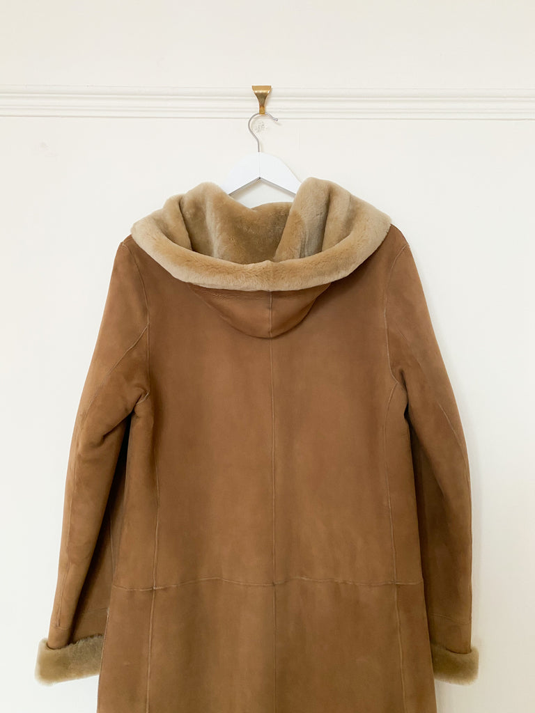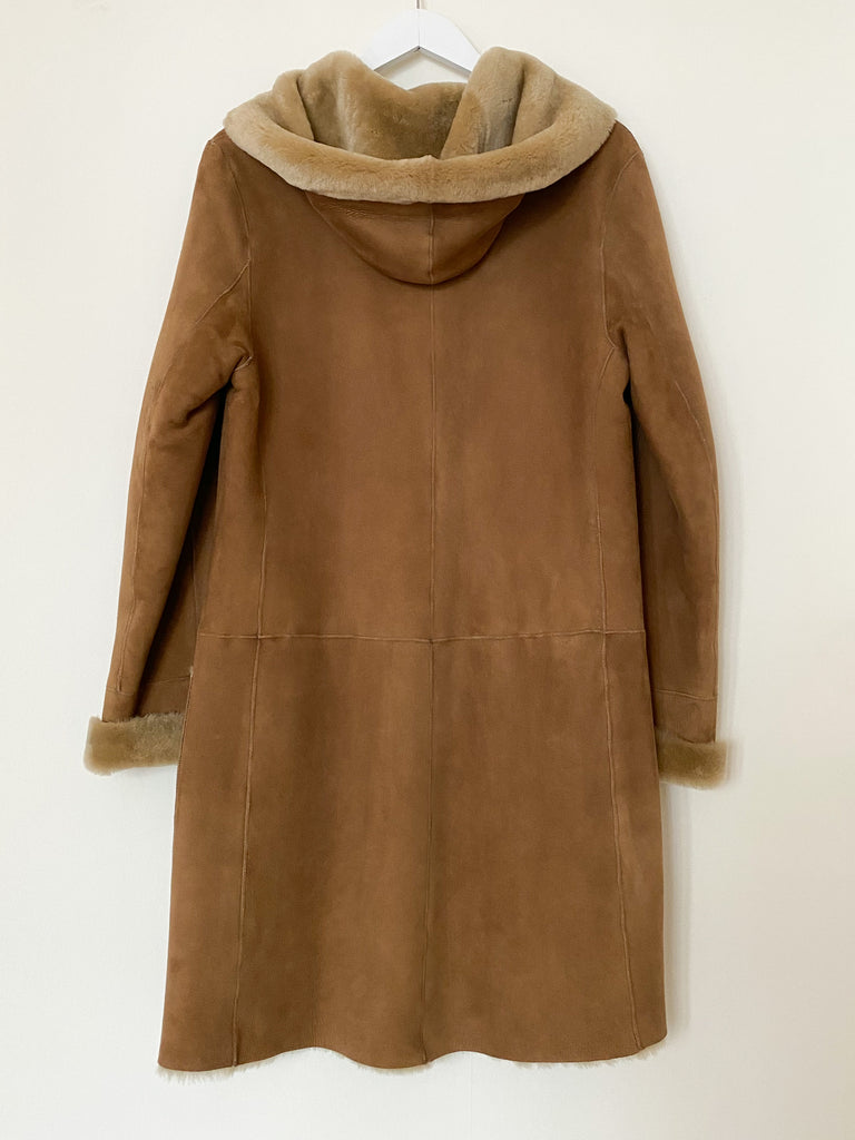 Handcrafted biscuit suede ¾ length car-coat with honey shearling lining made in our London studios.