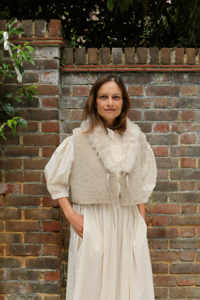 A simple shirt collar, with soft ruffles accentuating the pin-tucked bib detail. Softly puffed shoulders with elasticated 3/4 sleeves. Tie-fastening at the waist, giving a floaty volume to the silhouette and generous length.