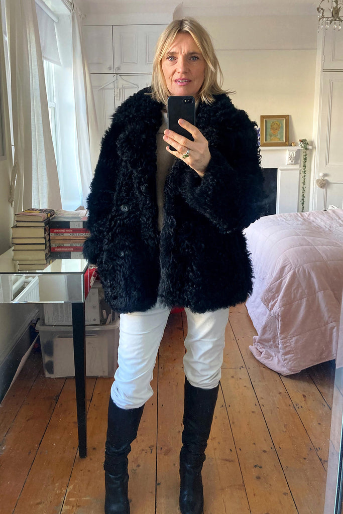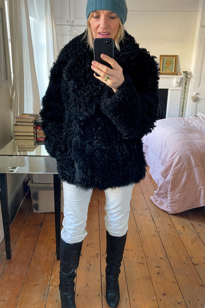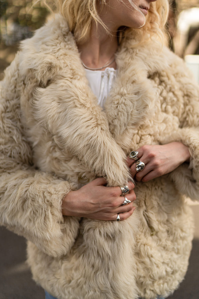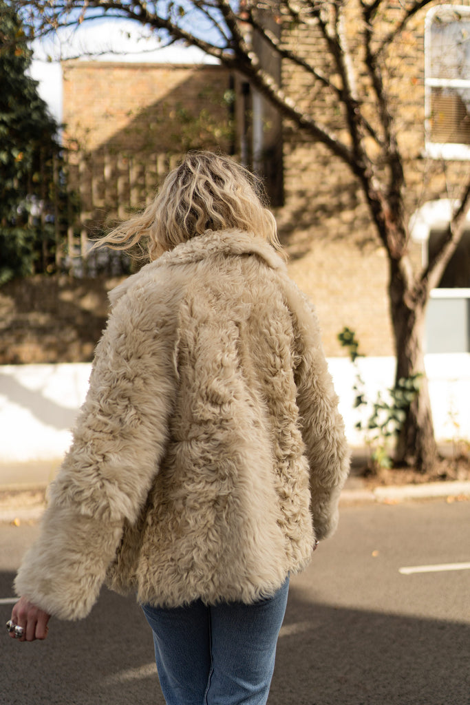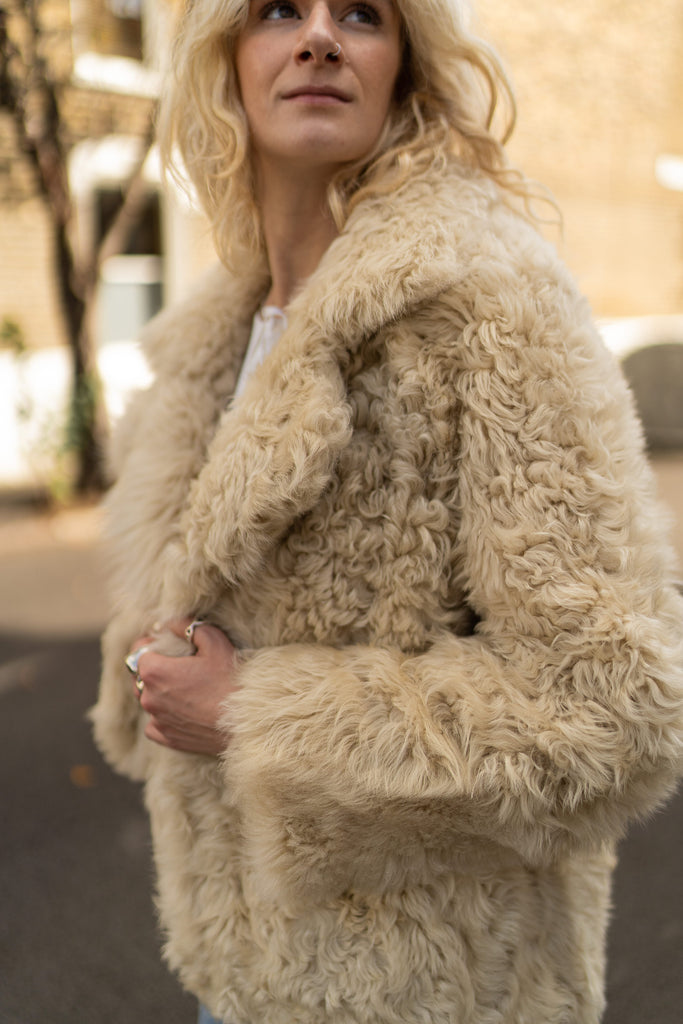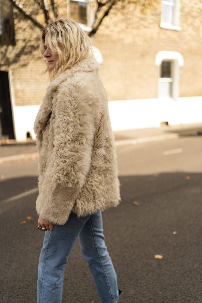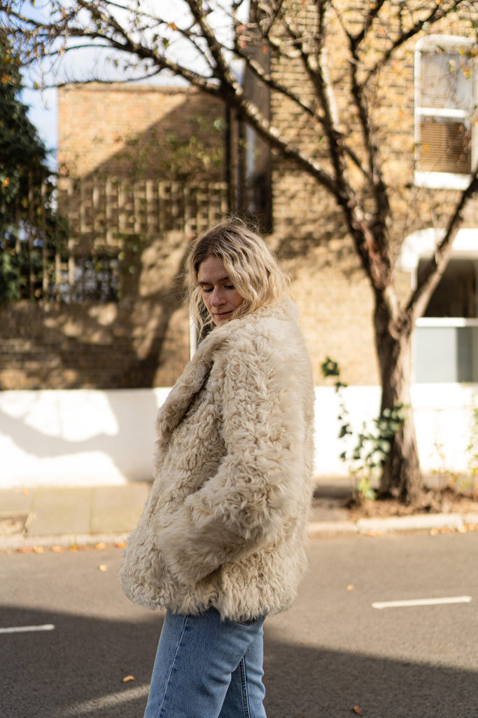 Sister to our curly Tilgrado shearling coat, our Vanilla Curly Short Shearling Jacket is a generous length, hitting just on the hips. Big collar and double-breasted makes it ideal for wrapping up warm. The curly shearling adds depth and texture whilst also being super soft. Buttons up with two front pockets.